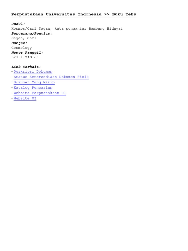 Perpustakaan Universitas Indonesia Buku Teks Kosmos Carl Sagan Kata Pengantar Bambang Hidayat